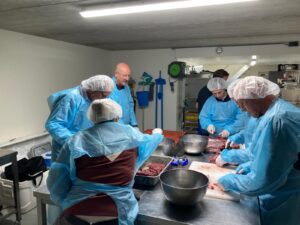 Voor iedereen ligt een werkschort, handschoenen en haarnetje klaar. Wie het mes in eigen hand wil nemen is van harte uitgenodigd. Alleen kijken en leren kan natuurlijk ook. In het 2e deel van de workshop gaan we in op de basistechnieken van het bereiden en bewaren. We maken samen een aantal verse eindproducten voor de wildproeverij klaar.