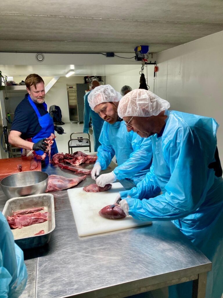 Afankelijk van het aanbod zorgen we voor één of twee stukken grofwild in het vel (Ree, Wild Zwijn of Hert). Deze gaan we vervolgens in de werkruimte in de kelder uit het vel halen, opdelen in technische delen, vliezen en portioneren. Tijdens het uitbenen vertellen we u welke delen u voor welke gerechten / producten kunt gebruiken.